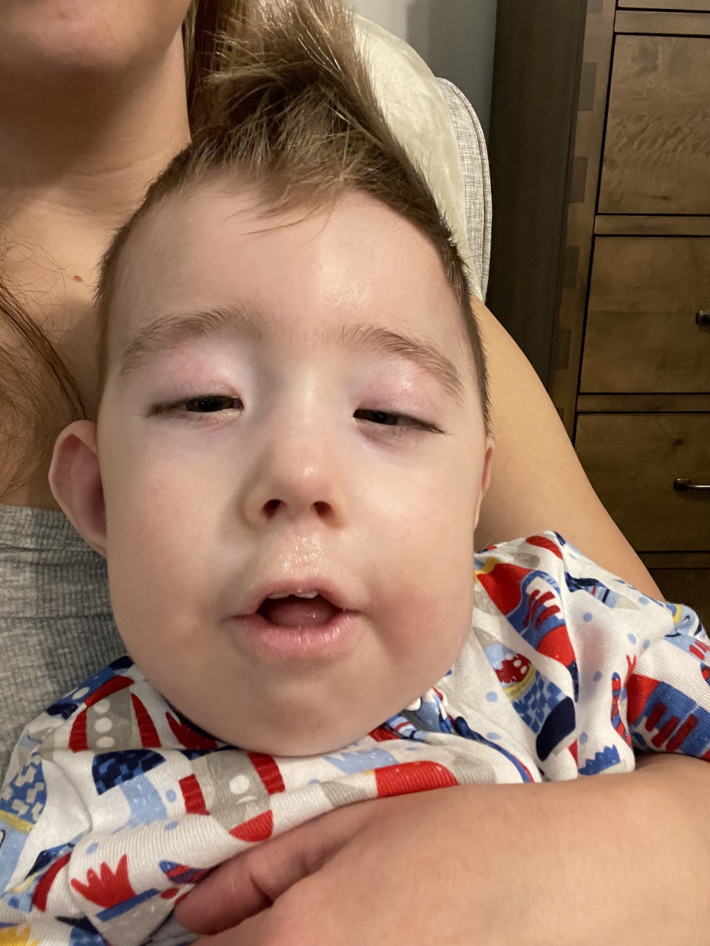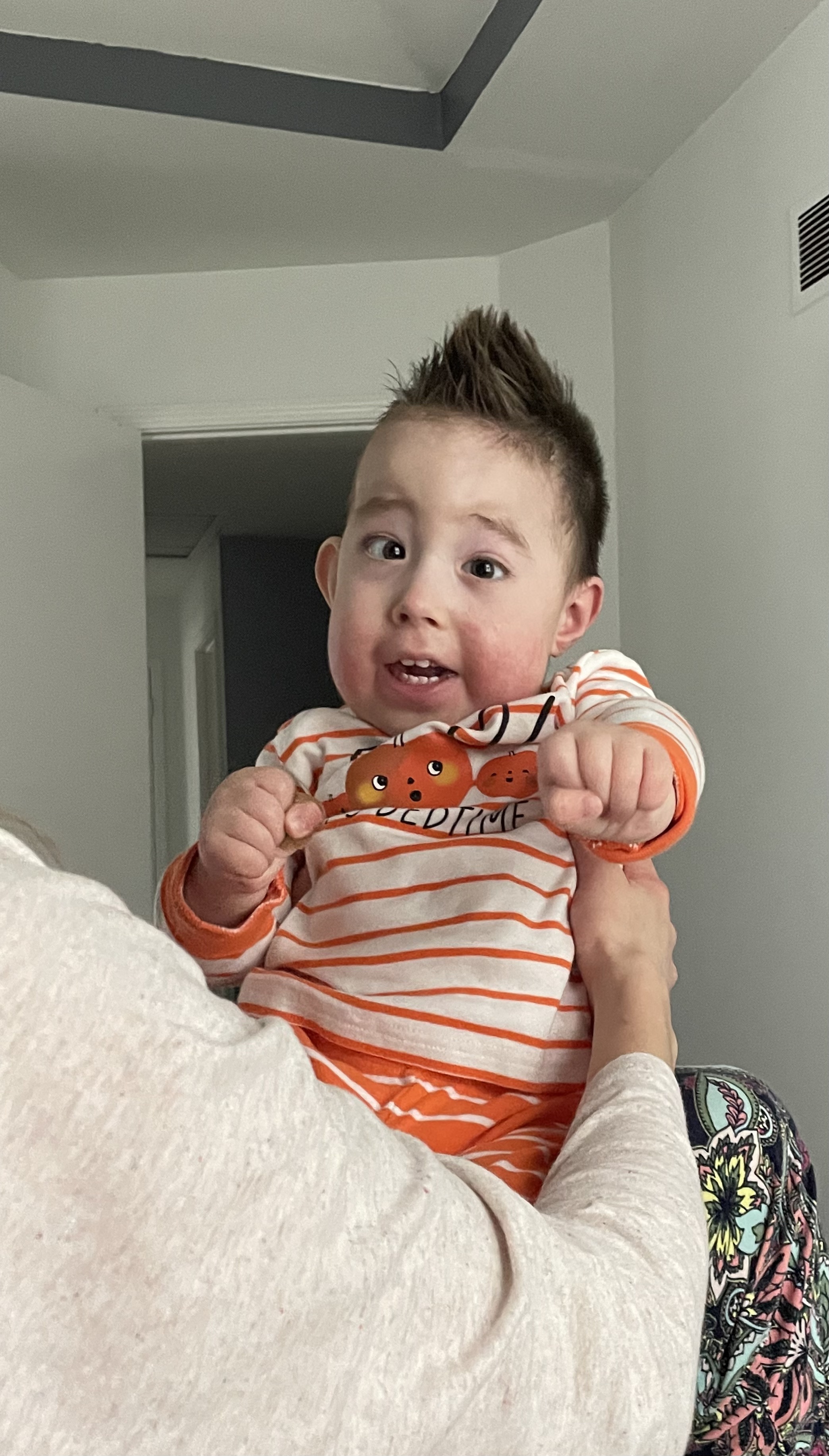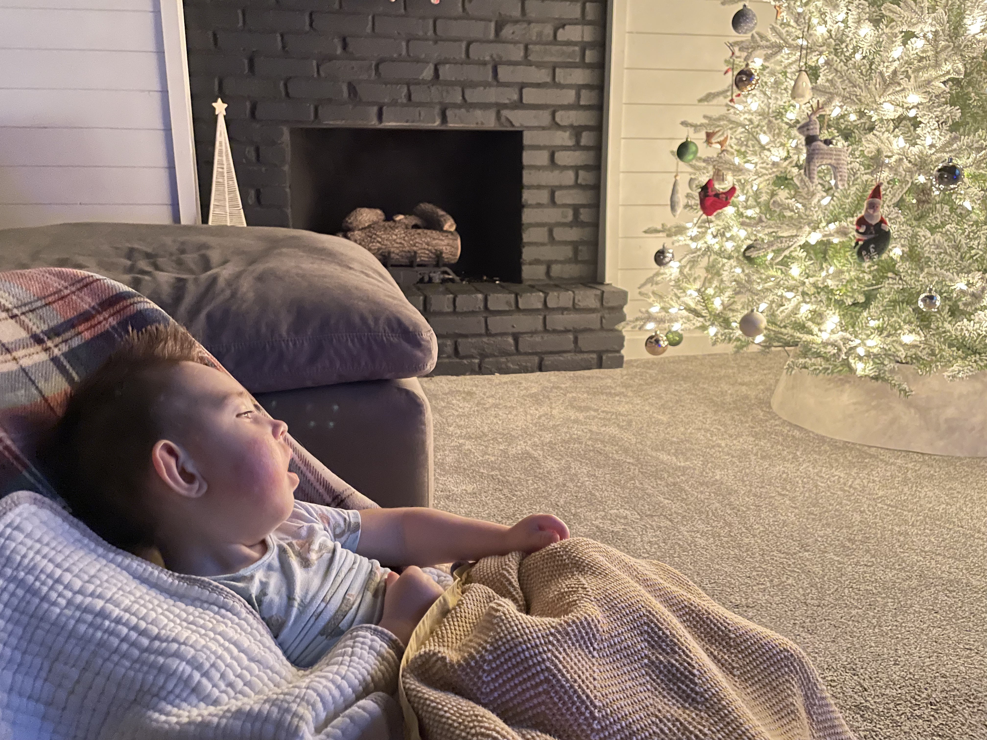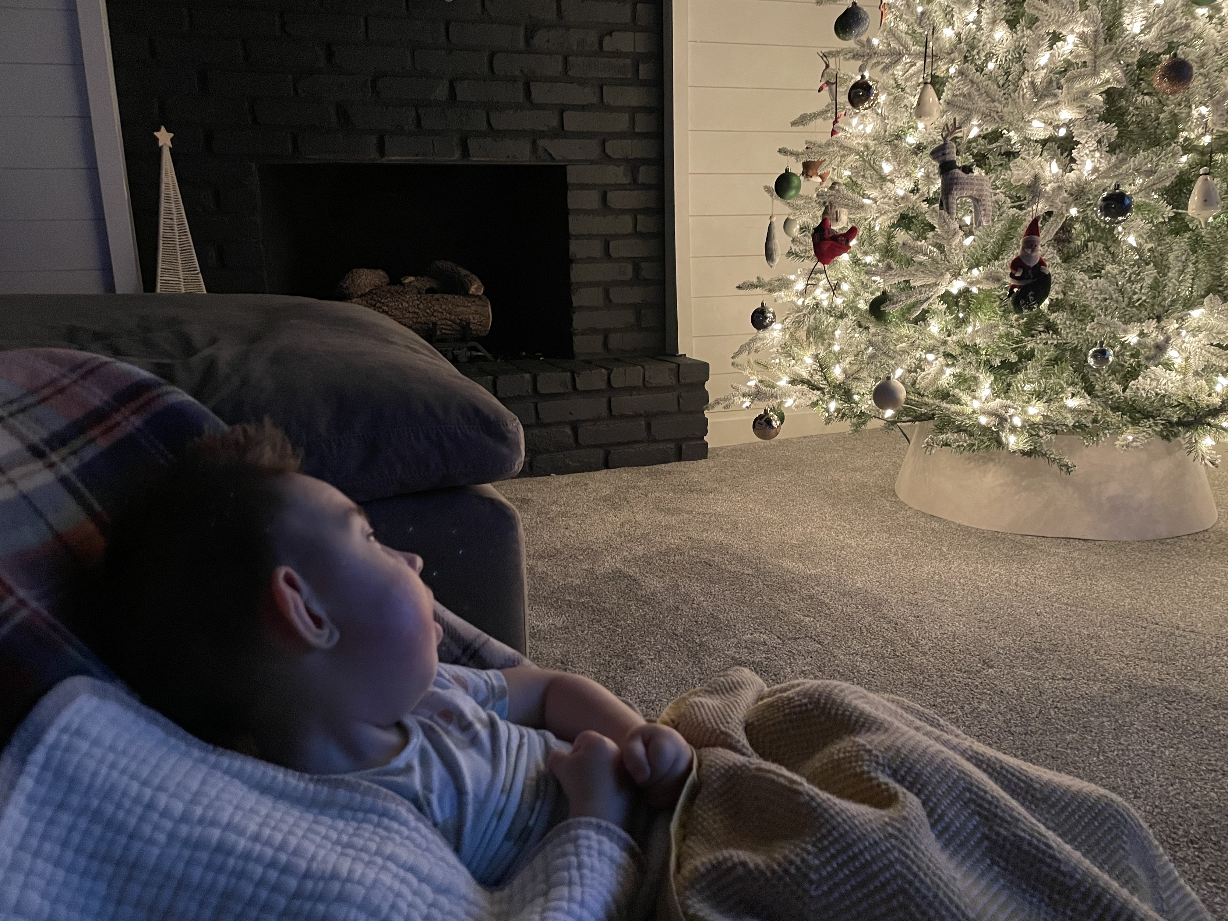 Dax has still been very talkative lately and starting to make different sounds, he makes us laugh a lot! Ozzie has noticed Dax talking more and he’s a little more inquisitive about his brother; it seems like he’s testing the boundaries with Dax all over again. Dax really enjoys bouncing, rocking in the rocking chair, and I can really get a laugh out of him if I toss him up in the air. He likes listening to music and as always, loves being outside. Since the weather has recently turned, Dax has been enjoying the lights on the Christmas tree.