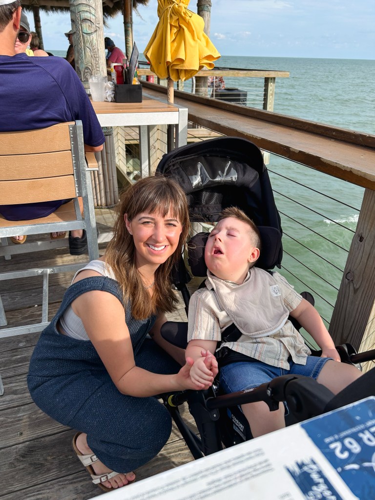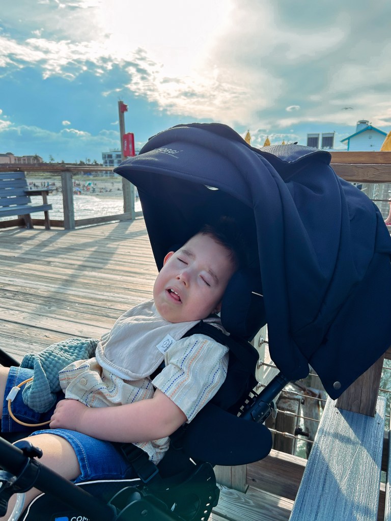The next day, we had a beach day. Dax got his toes in the sand and dipped them in the Atlantic Ocean. We dedicated an entire day to be near the waves. We had lunch on the pier, Bodie jammed out to some Teddy Swims, and Dax cooed and smiled, and loved the breeze blowing through his hair. Dax was in his element and happy. Once again, Bodie took great pride in pushing his brother in his stroller down the pier.