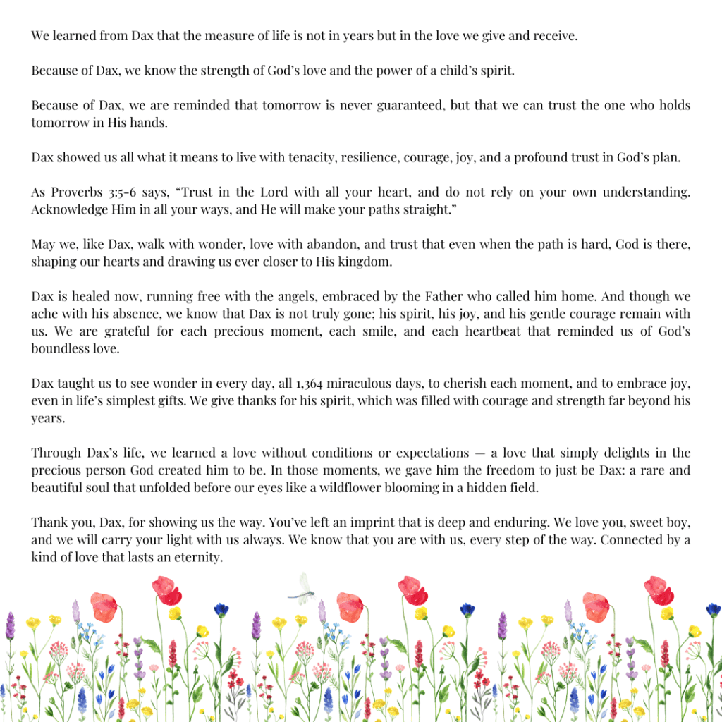 Dax reached the top of the mountain peak, he didn’t plummet to the ground. He won the fight, and finished his last marathon — it wasn’t a first place trophy or a gold medal, but the ultimate gift of heaven. We are so proud of Dax, he did such a phenomenal job each and every day. He faced challenges daily, and all that he went through, he deserved the peaceful transition that God gave him. Dax’s life on Earth was a beautiful journey… We have so much that we are grateful for and at the same time, it’s heart wrenching; truly a double-edged sword. Throughout all of the fog we have still experienced clarity; clarity in the choices made for Dax’s visitation and private ceremony, clarity on how to put our son’s life into words in an obituary, and clarity in designing his headstone. Our faith and trust in God will continue to carry us through.